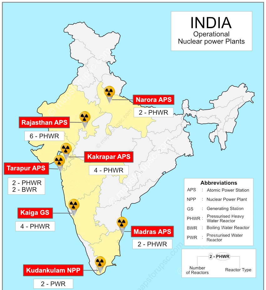 • India currently has 24 reactors across 7 power plants with installed nuclear energy capacity of 8,780 MW comprising 24 nuclear power plants (excluding RAPS-1 – 100 MW). (March 2026)